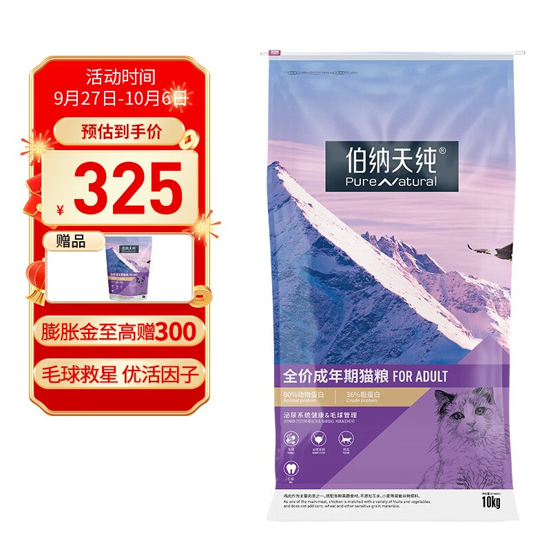 ¥315 伯纳天纯宠物低敏猫粮成猫主粮营养发腮加菲猫蓝猫通用12月龄以上经典系列 成猫猫粮20斤 325