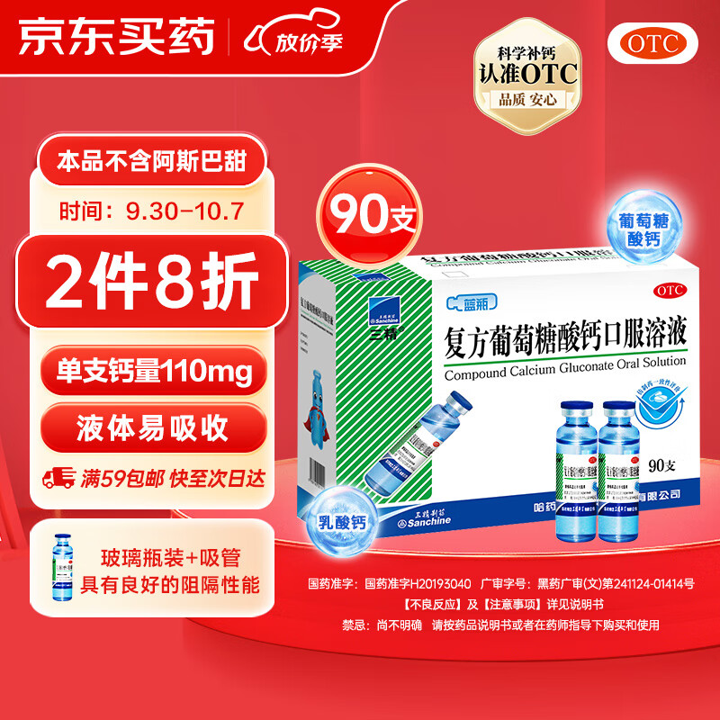 ¥205 三精复方葡萄糖酸钙口服溶液10ml*90支儿童补钙蓝瓶钙铁锌口服液 液体钙 治疗钙缺乏骨质疏松手足抽搐 235