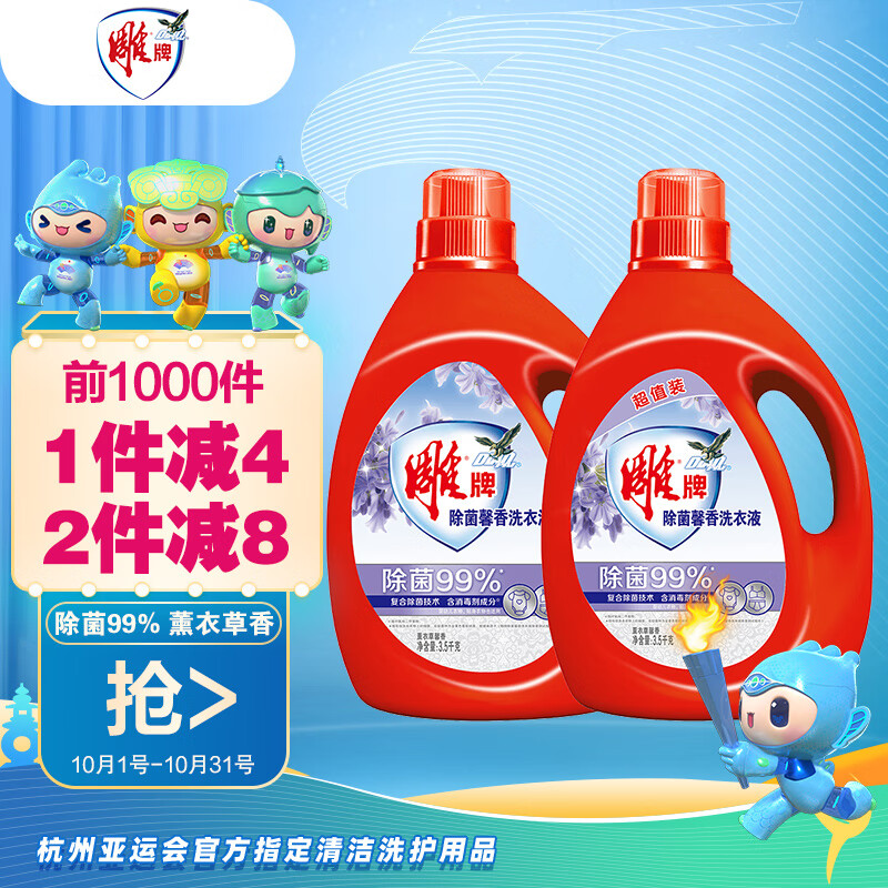 ¥53.9 雕牌 除菌馨香洗衣液3.5kg*2瓶 除菌率99% 薰衣草香(新老包装随机发 69.9