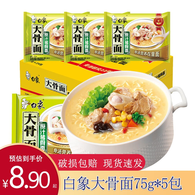 ¥14.9 白象 大骨面方便面骨汤方便面75g*5袋装 方便速食 原汁猪骨面75g*10包 19.9