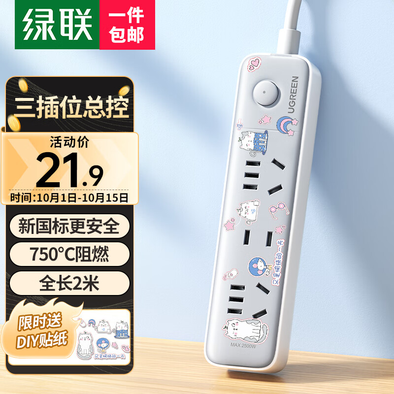 ¥19.9 绿联 插排/插线板/排插/桌面插座拓展新国标插板大间距孔距接线板宿舍家用拖线板四位六位八位五孔带开关 热推【3位总控】2五孔+1两孔,全长2米 21.9