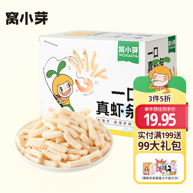 ¥36.9 窝小芽儿童零食一口真虾条 高钙虾片饼干泡芙非油炸28%虾肉添加20g*5/盒 39.9