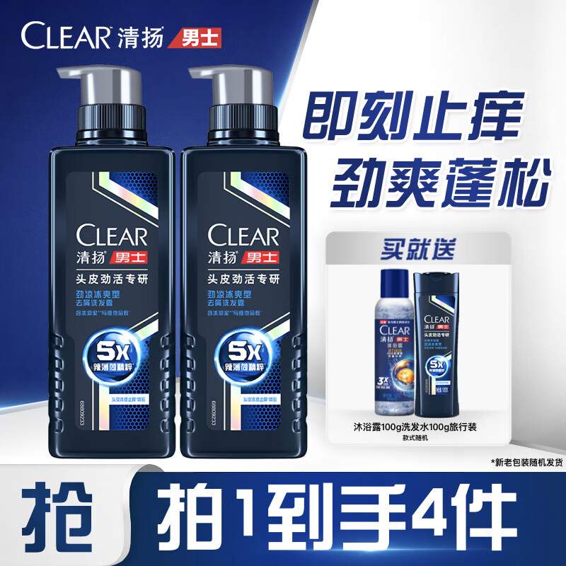 ¥98.9 清扬(CLEAR)男士头皮劲能瓶专研5倍冰爽型洗发水570g*2+洗头100g+沐浴露100g 128.9