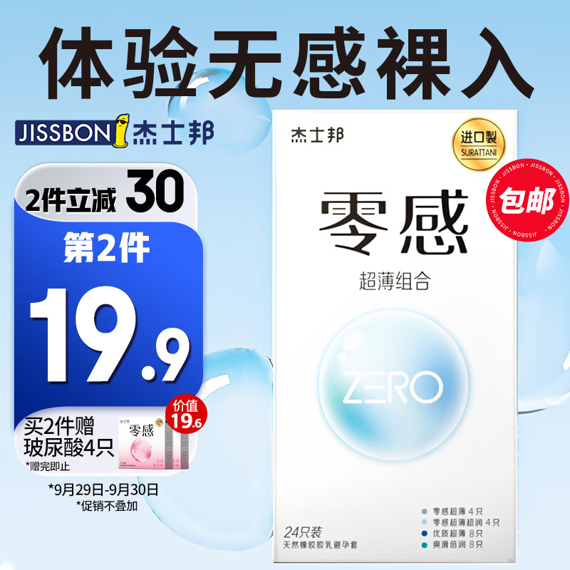 ¥29.9 杰士邦 避孕套超薄 安全套 ZERO零感24只组合 隐形裸感 玻尿酸 男用套套 计生用品 49.9