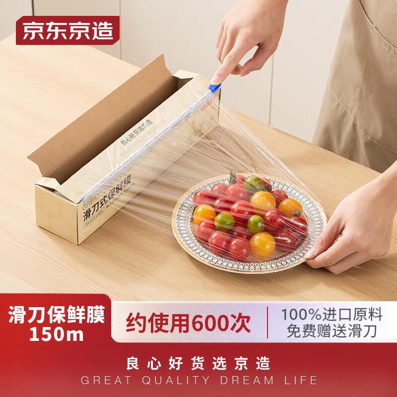 ¥14.9 京东京造 一次性保鲜膜150米 免刀撕自带滑刀切割器 30cm宽盒装 19.9