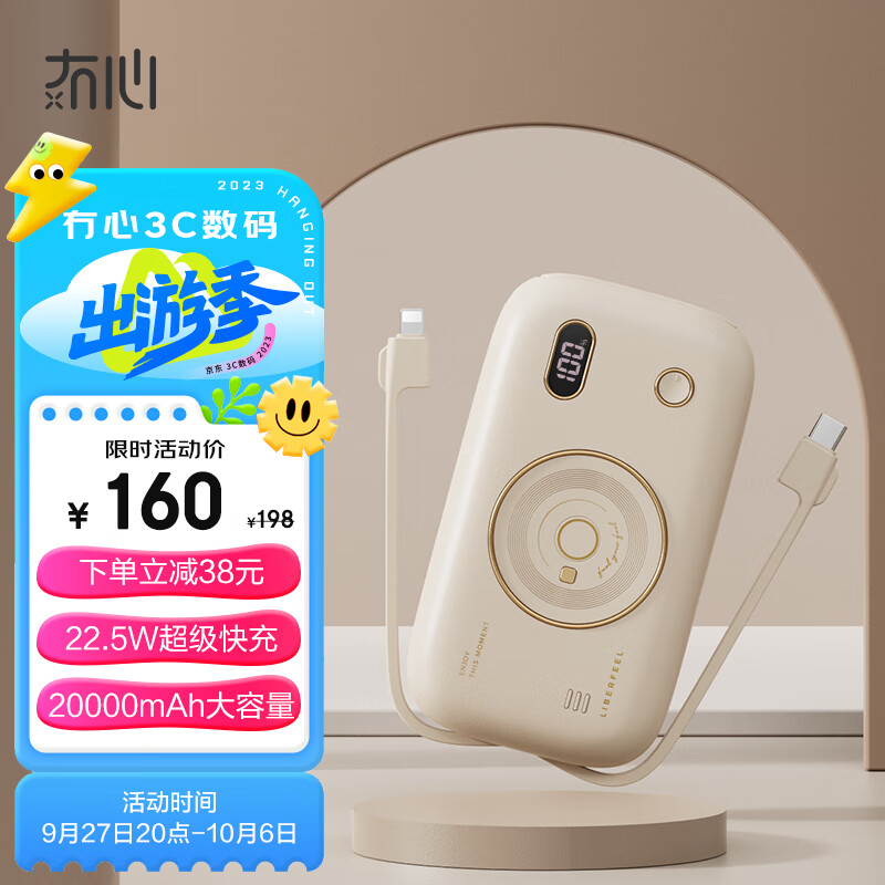 ¥148 冇心幻音 充电宝20000毫安时 22.5W超级快充 大容量移动电源 复古自带线20W苹果PD数显 适用苹果安卓华为小米 178