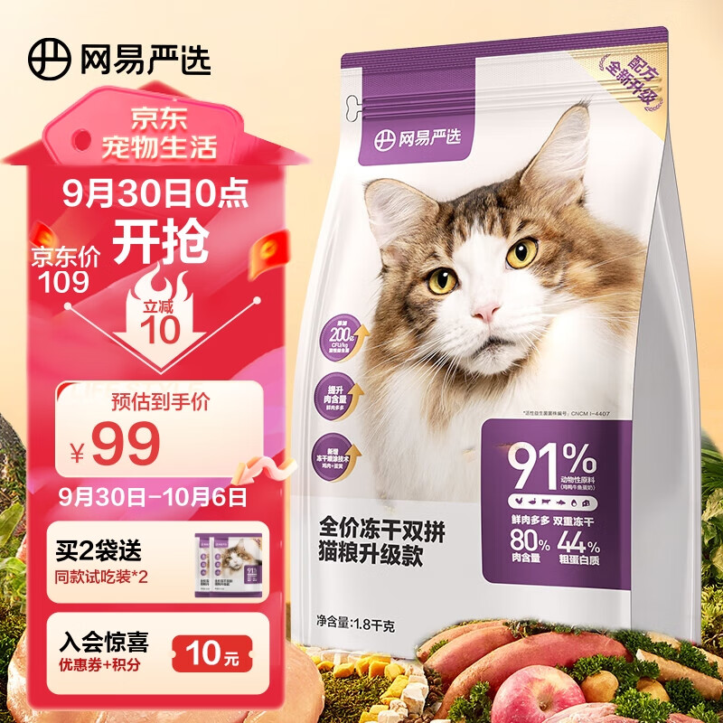 ¥94 网易严选 全价冻干双拼猫粮宠物主粮幼猫成猫全价天然无谷粮猫咪食品1.8kg 99