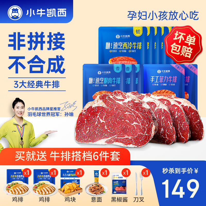 ¥190 小牛凯西 国产整切牛排套餐 西冷眼肉厚切牛肉意面鸡排新鲜牛扒生鲜 5片西冷+3片眼肉+2片菲力 200