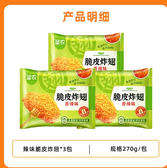 53.1元包邮!圣农 原味香辣脆皮炸翅中冷冻半成品空气炸锅食材3包/4包烤箱美食