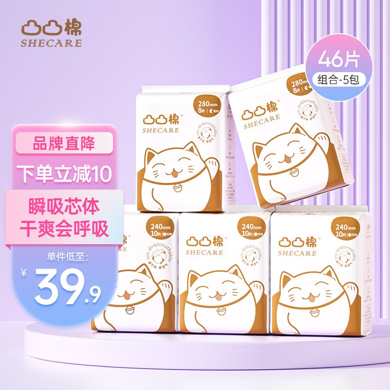 ¥29.9 凸凸棉棉柔卫生巾透气干爽学生姨妈巾加长瞬吸日夜组合套装 日用3包+夜用2包 共46片 49.9