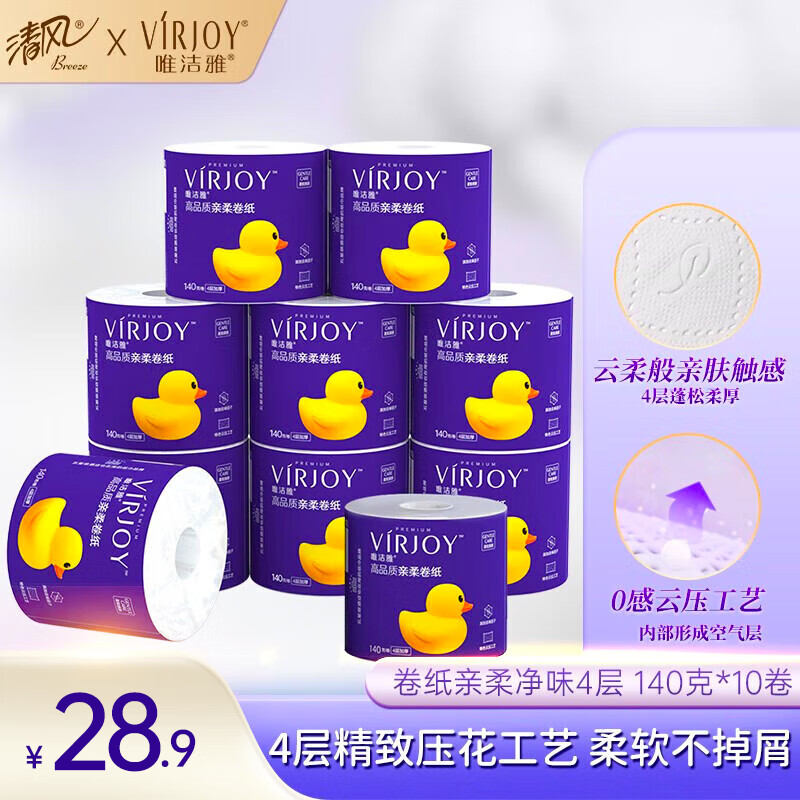 ¥28.9 唯洁雅【清风高端】卷纸厕纸手纸4层140g柔和亲肤易降解有芯卷筒卫生纸 4层140克*10卷/提 33.9