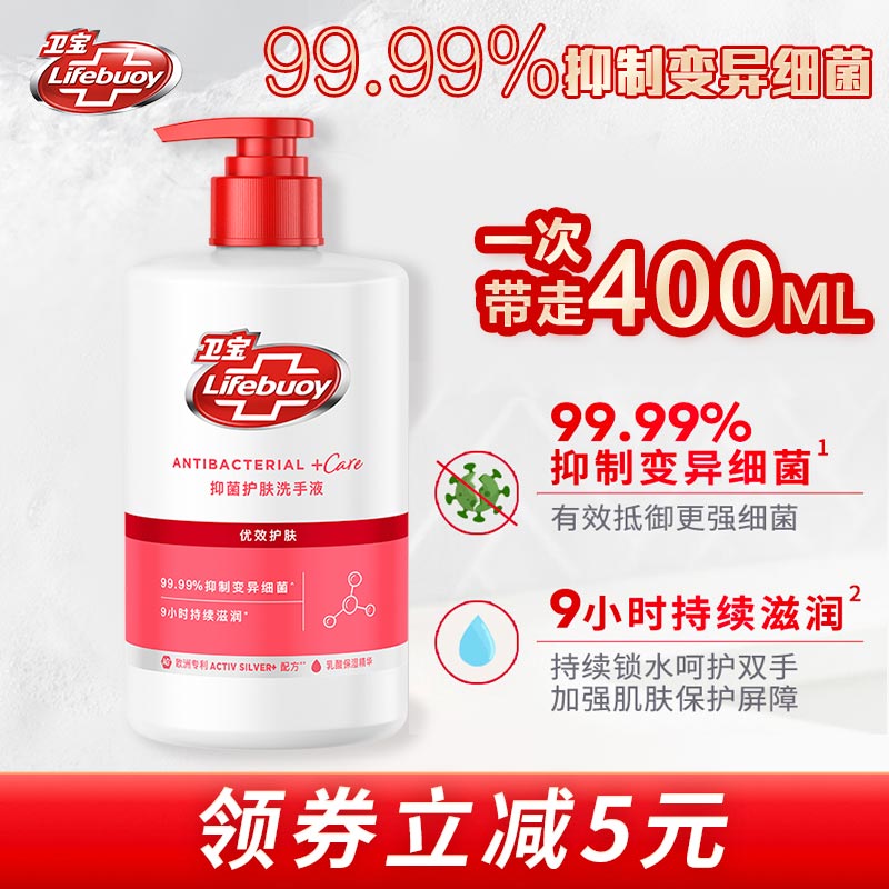 ¥9.9 lifebuoy卫宝抑菌洗手液 优效护肤 滋润温和400g 1瓶 99.99%抑制变异细菌 14.9