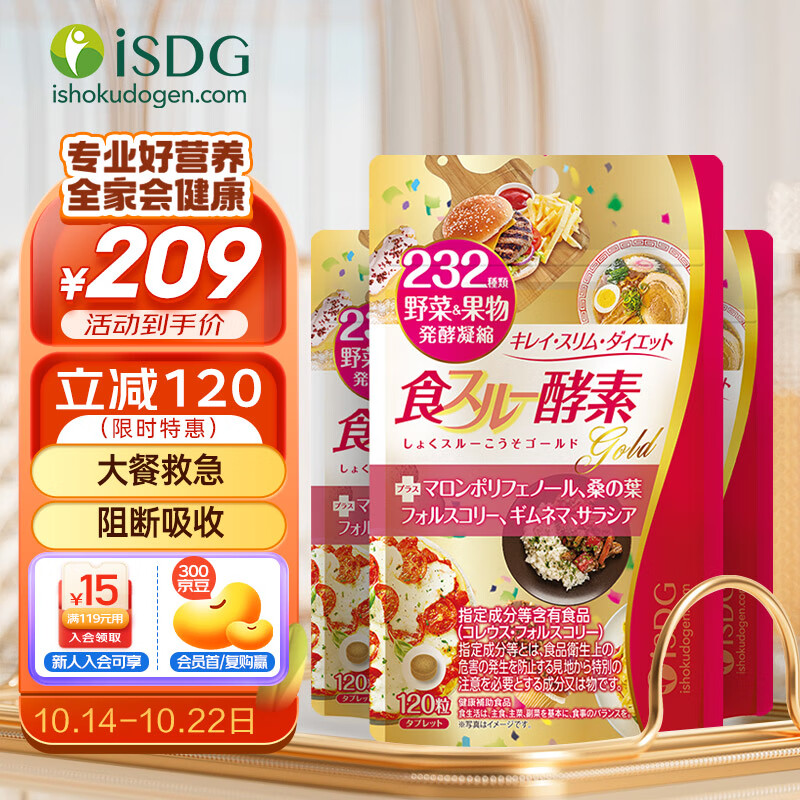 ¥329 ISDG黄金酵素120片3件装 果蔬植物孝酵素片 日本酵素 加强版进口大餐甜食酵素 359