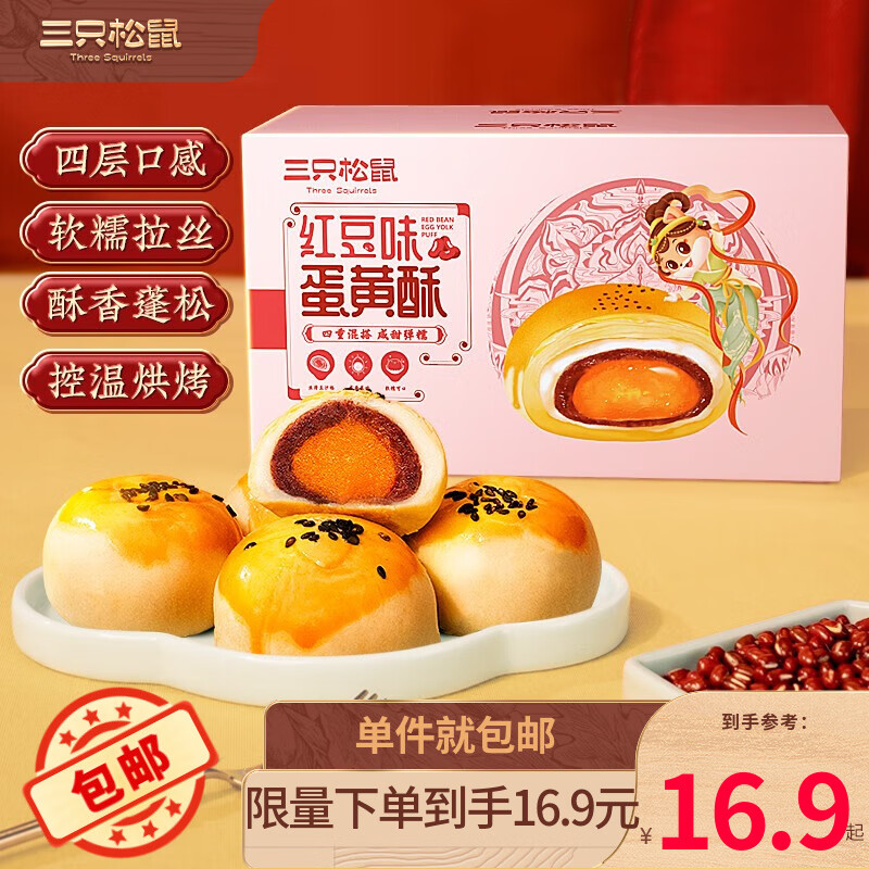 ¥12.9 三只松鼠蛋黄暖心酥蛋黄酥红豆雪媚娘流心网红零食小吃点心烘焙糕点 红豆味蛋黄酥500g 16.9
