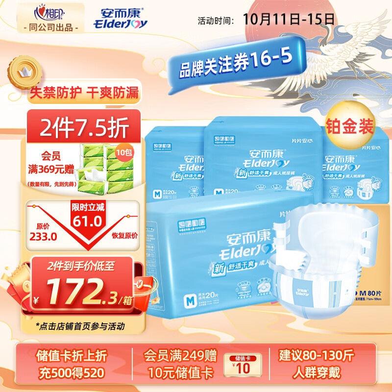 ¥228 安而康(Elderjoy)舒适干爽成人纸尿裤M80片 老人产妇尿不湿双芯防漏 臀围80-105cm 233