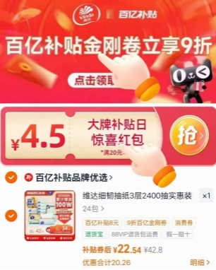 22.5元包邮!维达细韧抽纸100抽*24包