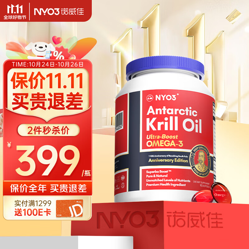 ¥448 NYO3诺威佳挪威纯南极磷虾油软胶囊 阿蒙森纪念版 鱼油升级56%磷脂DHA EPA omega-3中老年成人 海外进口 498