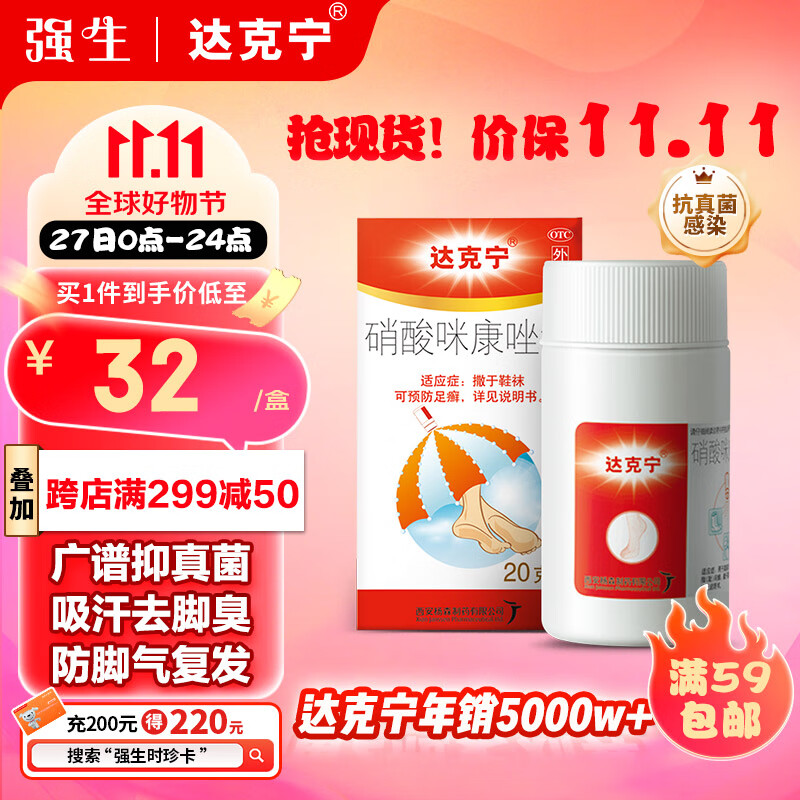 ¥32.6 达克宁散硝酸咪康唑散20g去脚气粉脚臭粉脚臭专用药烂脚丫脱皮脚痒烂脚丫脚趾缝足藓脚癣脚出汗脚臭止汗 37.6