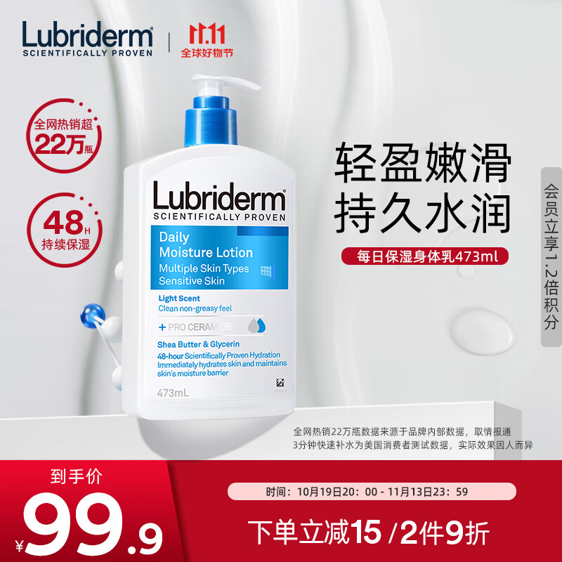 ¥89.9 Lubriderm露比黎登每日保湿身体乳 补水润肤露润肤乳淡香清爽不粘腻473ml 109.9