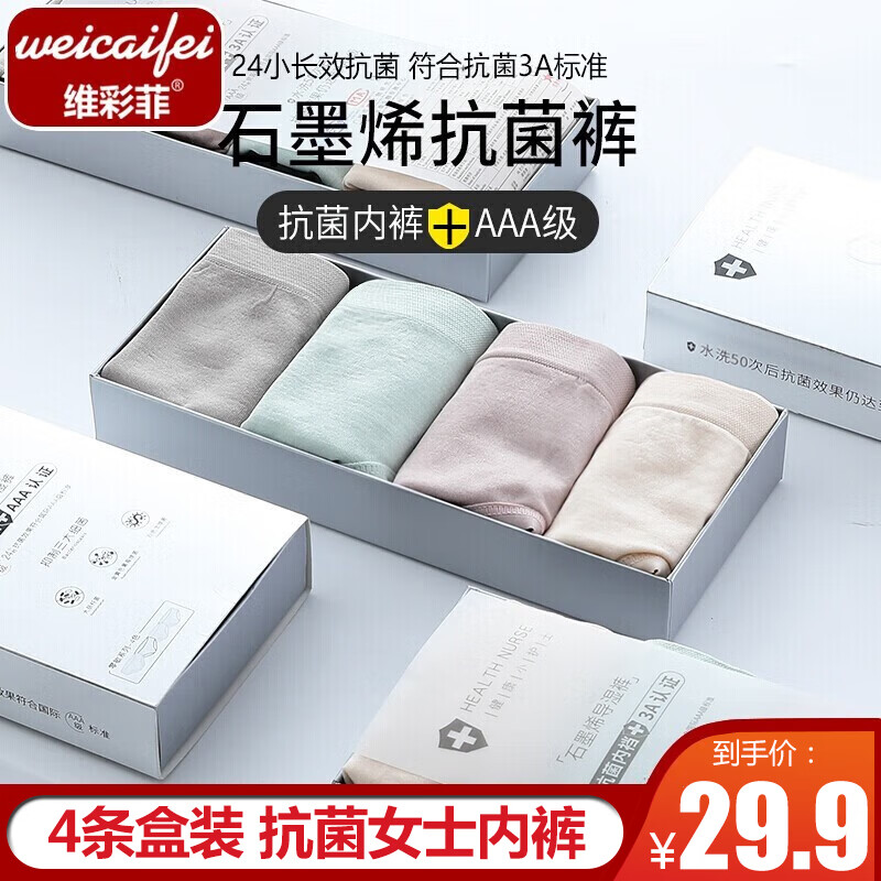 ¥19.9 维彩菲 4条盒装简约纯色抗菌内裤女士亲肤抑菌三角裤女舒适透气中腰内裤 【4条盒装】肤色+浅绿+粉色+粉灰 29.9