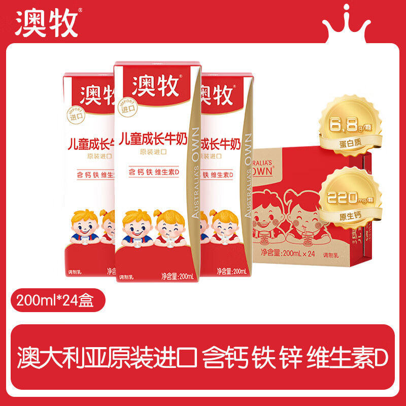 ¥186.1 澳牧(Australia's Own)儿童成长牛奶 原装进口全脂学生早餐奶 200mlx24盒 198