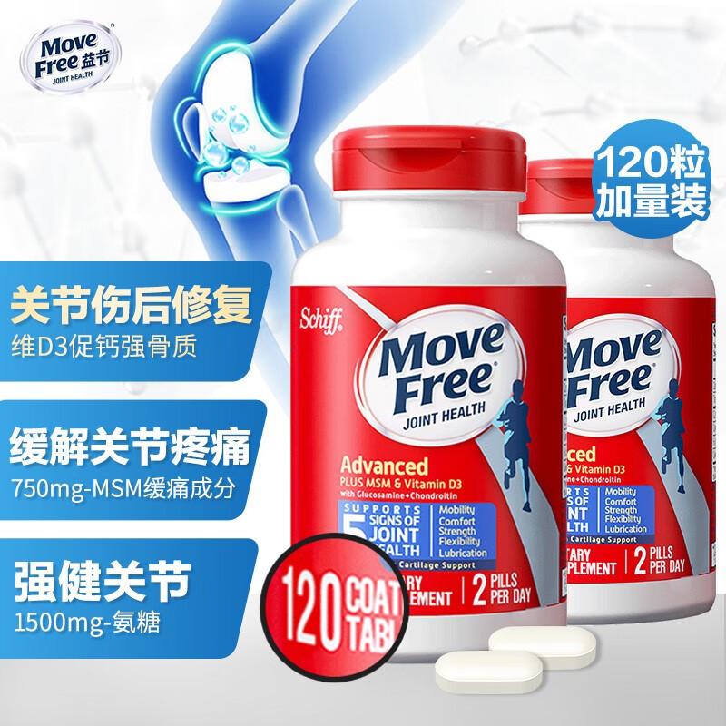 ¥448 Move Free益节 氨糖软骨素钙片 美国进口维骨力 盐酸氨基葡萄糖 骨维力成人老年人护关节健康 【关节伤后修复】氨糖蓝瓶120粒*2 688