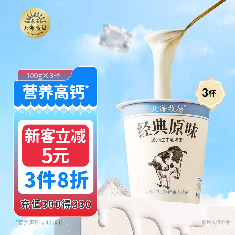 ¥9.8 北海牧场经典原味酸奶100g*3杯 高钙含量100mg/杯 低温酸奶酸牛奶 14.8