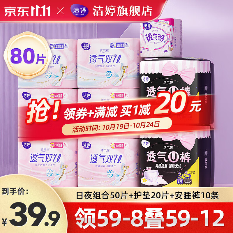 ¥49.9 洁婷绵柔卫生巾透气双U日夜用姨妈巾组合套装 日夜组合50片+护垫20+裤子10条 59.9