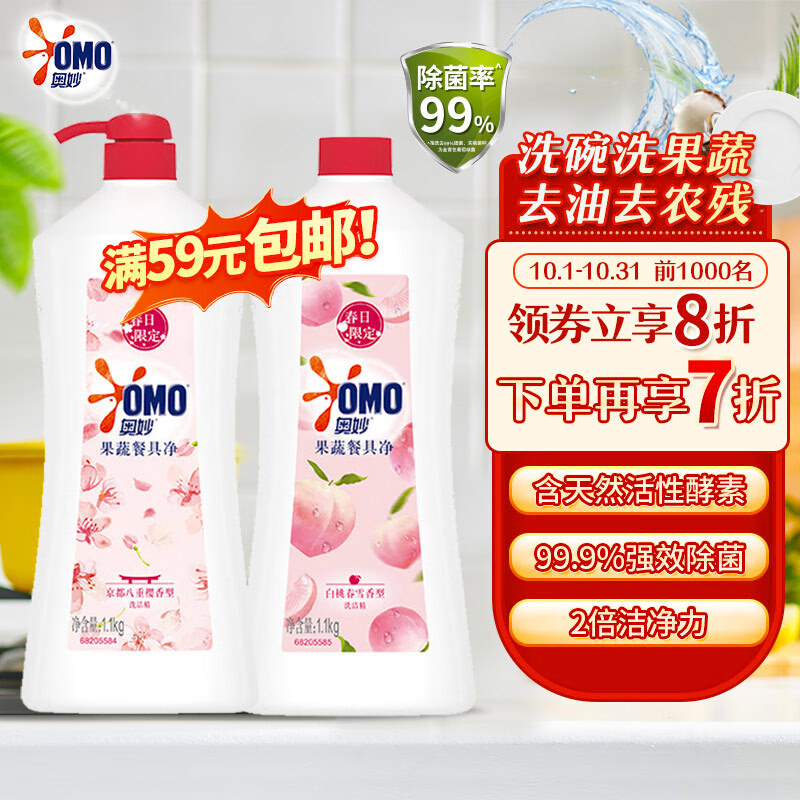 ¥46.1 奥妙自然工坊洗洁精果蔬餐具净 1.1KG*2 樱花+白桃香型 含替换装 49.9