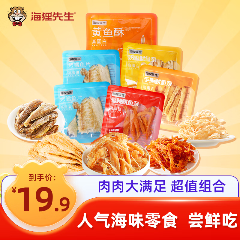¥9.79 海狸先生海味零食独立礼包深夜解馋休闲零食大连特产鱿鱼条烤鱼片 黄鱼酥1袋+鱿鱼条3袋+鳕鱼片2袋 11.79
