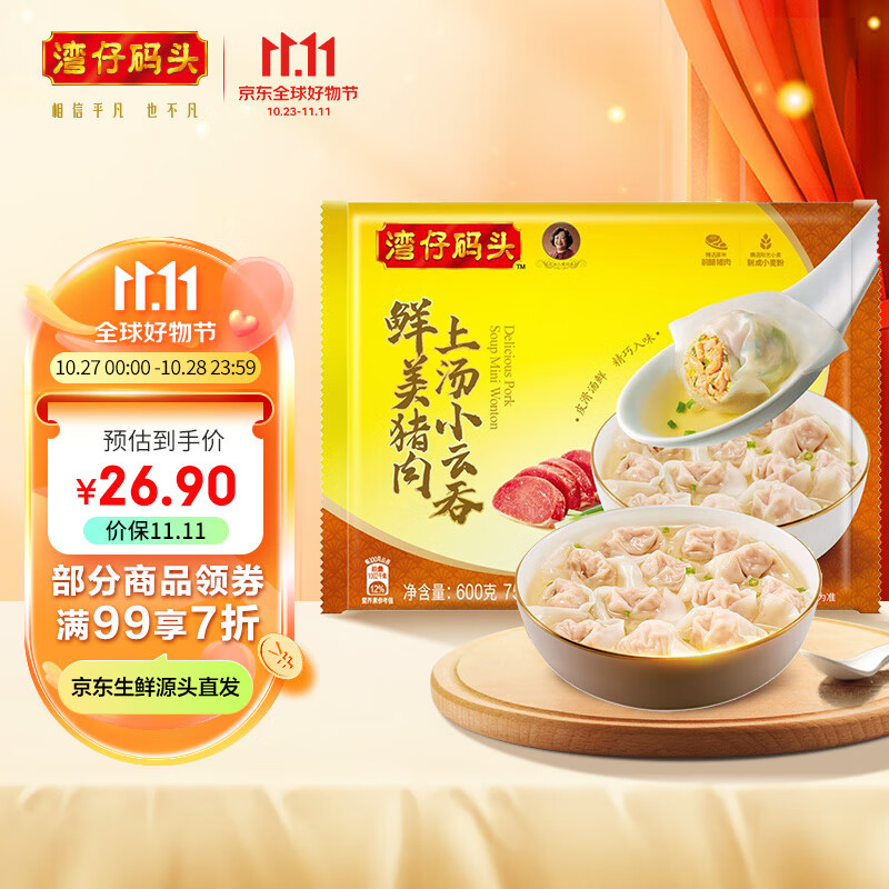 ¥26.9 湾仔码头 上汤小云吞鲜美猪肉 600g 75只 早餐夜宵 生鲜 速食 小馄饨 云吞 31.9