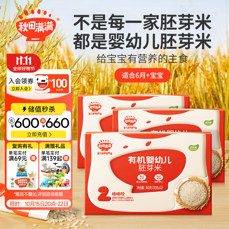 ¥113 秋田满满有机婴幼儿宝宝胚芽米谷物米儿童营养主辅食大米粥360g*3盒装 128