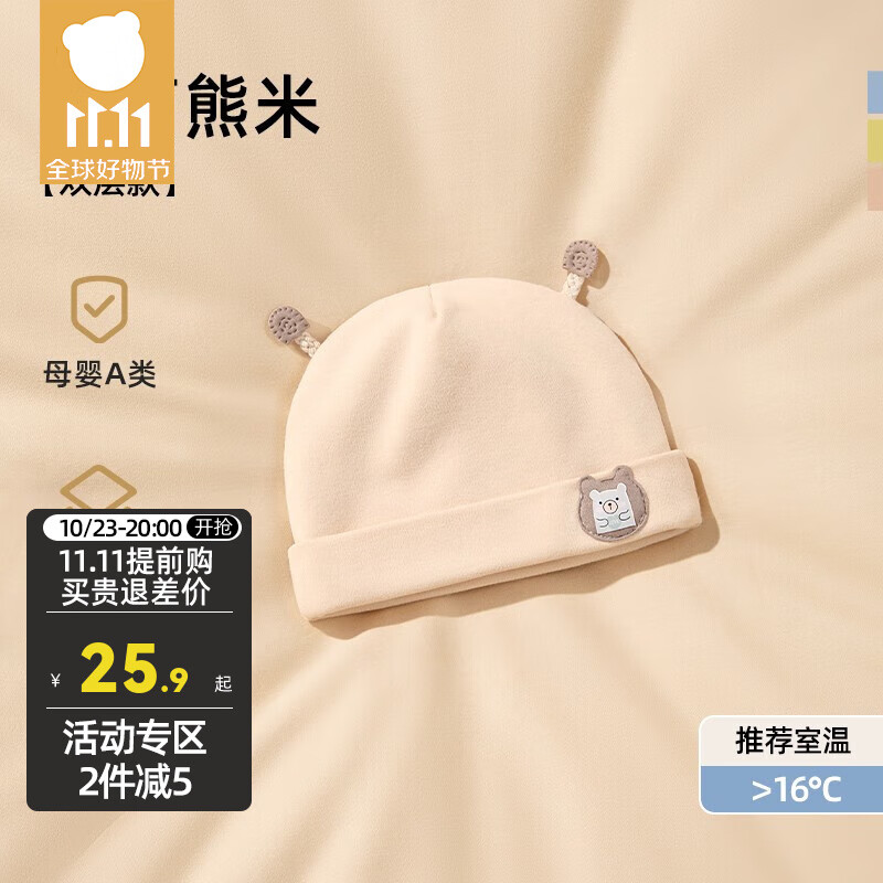 ¥15.9 贝肽斯婴儿帽子春秋款棉质胎帽新生儿宝宝秋季0-3月初生护头春秋囟门帽 小萌熊-米色 春秋 0-3个月 (帽围32-39cm) 25.9