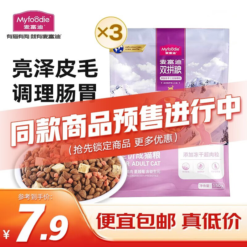 ¥7.9 麦富迪 冻干猫粮 超肉粒冻干双拼粮(冻干三文鱼) 成猫试吃包450g(150g*3) 17.9