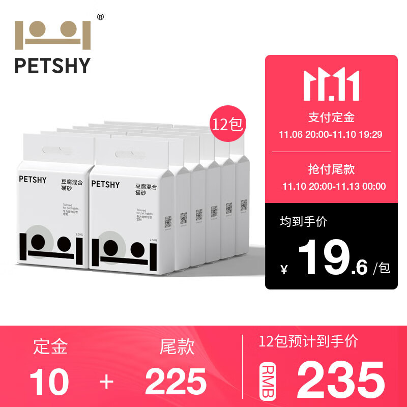 ¥269 petshy【年终预售】豆腐混合猫砂 膨润土除臭猫沙可冲厕秒结团30公斤 豆腐混合猫砂2.5kg*12包 299