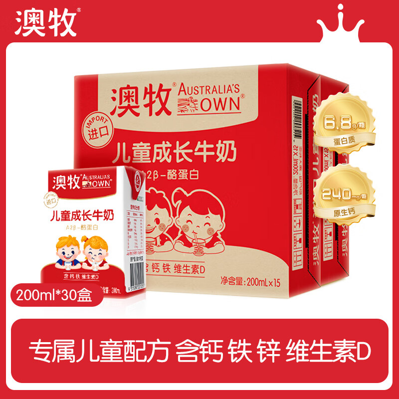 ¥225 澳牧(Australia's Own)儿童成长牛奶 A2-β酪蛋白铁锌VD营养早餐奶200ml*30盒 255