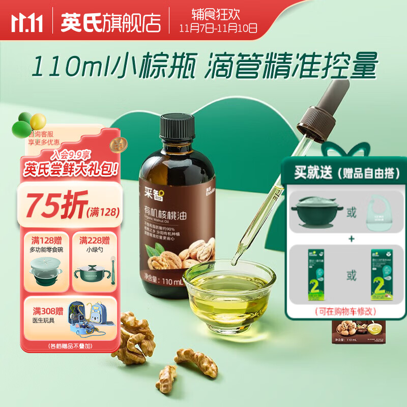 ¥50.7 英氏采智 有机核桃油 儿童辅食用油凉拌 送婴幼儿宝宝吸盘碗 有机核桃油110ml*1瓶 55.7