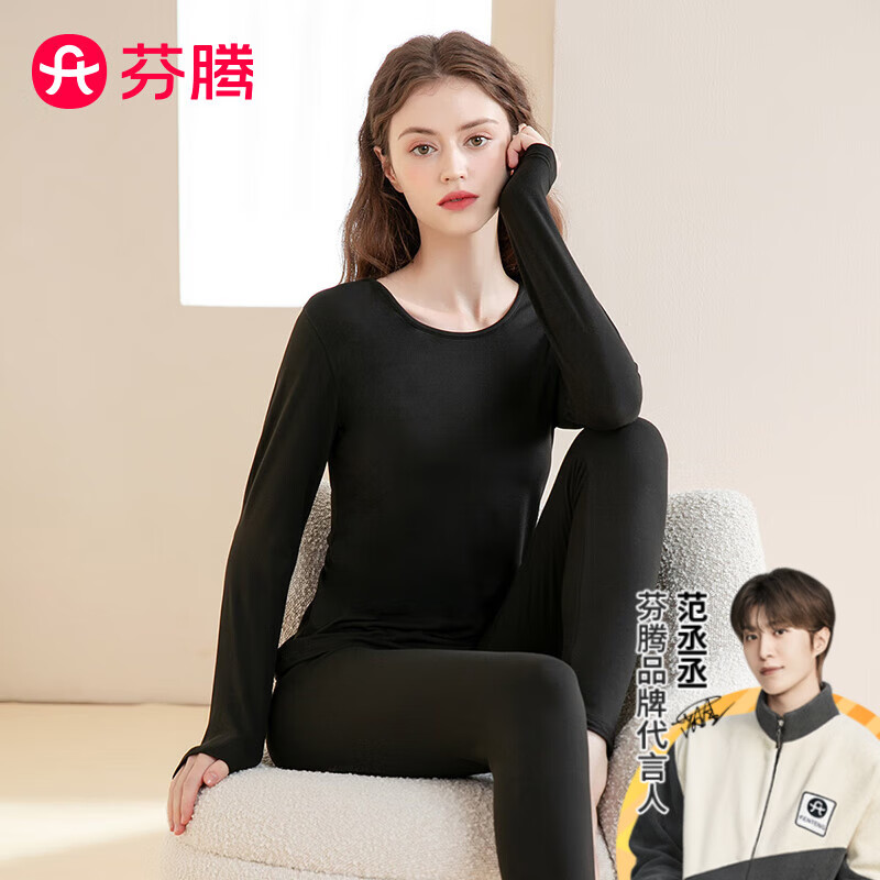 ¥97.9 芬腾保暖内衣女2023年秋季花边圆领内搭修身保暖打底内衣秋衣秋裤套装 黑色-女款2 L 109.9