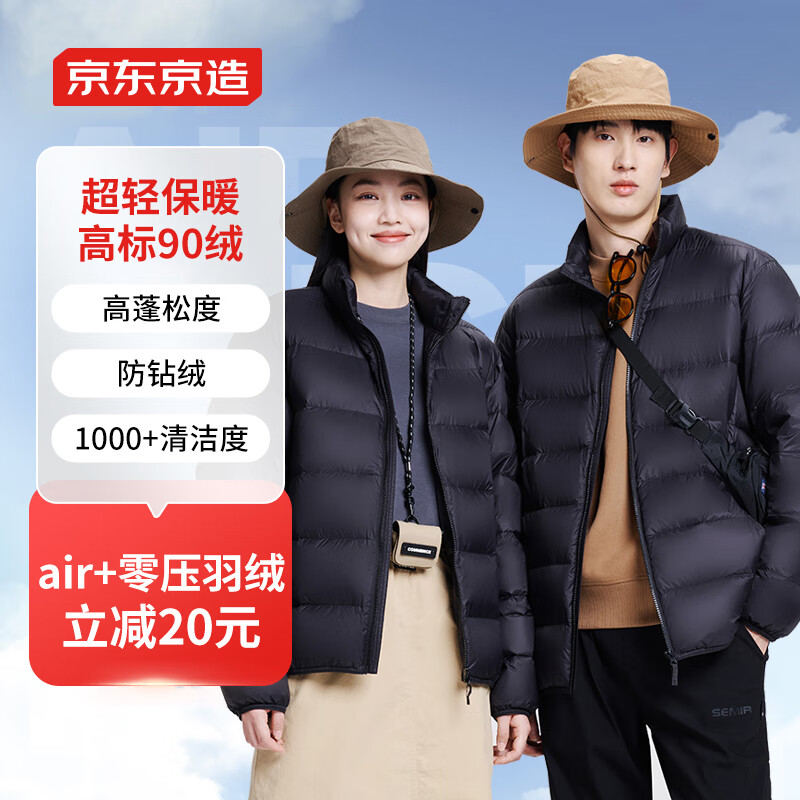 ¥229 京东京造【air+零压羽绒】面包羽绒服男外套冬 90绒白鸭绒立领 曜石黑L 279