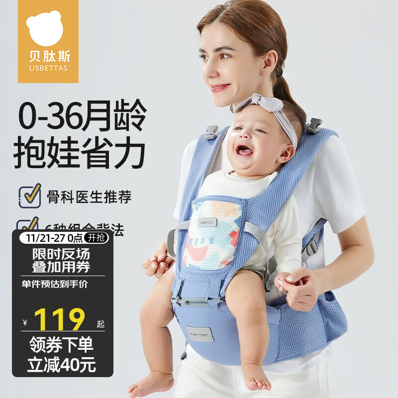 ¥89 贝肽斯腰凳婴儿背带前抱式0-36个月前后两用新生儿宝宝多功能背娃神器 透气款-莫斯蓝 159