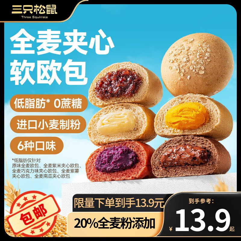 ¥12.9 三只松鼠欧包全麦紫薯巧克力紫米南瓜健康代糖早餐休闲零食粗粮代餐 1斤10个-奶酪3紫薯3紫米2原味2 13.9