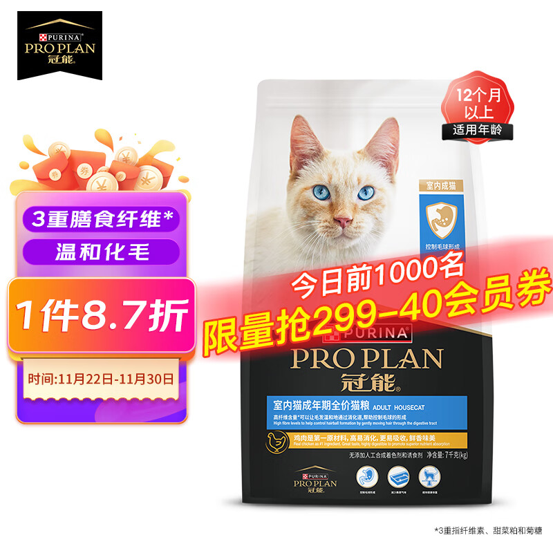 ¥299 冠能猫粮室内成猫猫粮7kg 减少毛球提高免疫 新老包装随机发 409