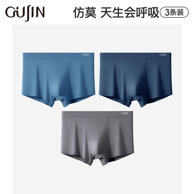 ¥54 GUJIN古今男士内裤仿莫宽松透气柔软短裤男四角裤衩男平角短裤3条装 中蓝-深蓝-深灰 XXL/180 59
