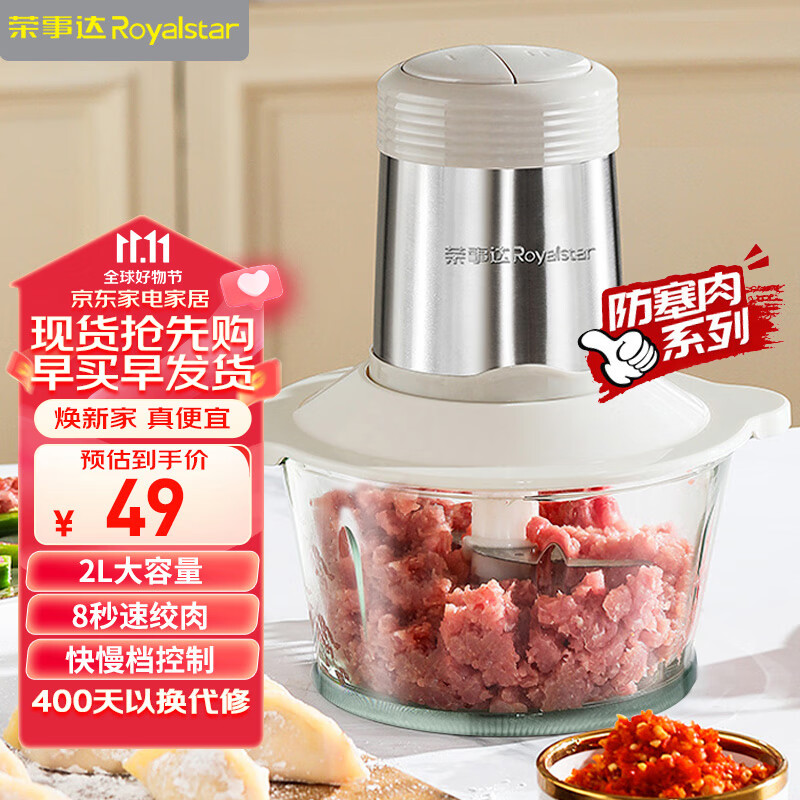 ¥39 荣事达(Royalstar)绞肉机家用电动多功能料理机切菜婴儿辅食机碎肉搅肉机饺子肉馅蒜蓉机RS-JR30R5【玻璃碗1副刀】 49