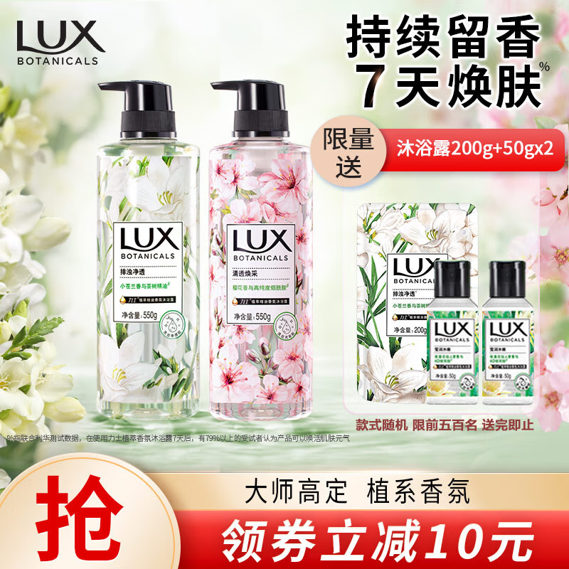 ¥64.9 力士(LUX)植萃精油香氛沐浴露套装小苍兰550g+樱花550g赠50gx2持久留香茶树 74.9