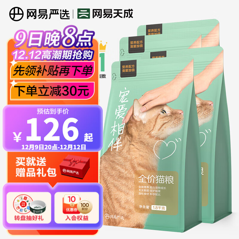 ¥116 网易严选【推荐】宠爱相伴全阶段猫粮 优质蛋白质 增加体质 公益猫粮 通用型 | 公益猫粮4袋共7.2kg 袋装 126