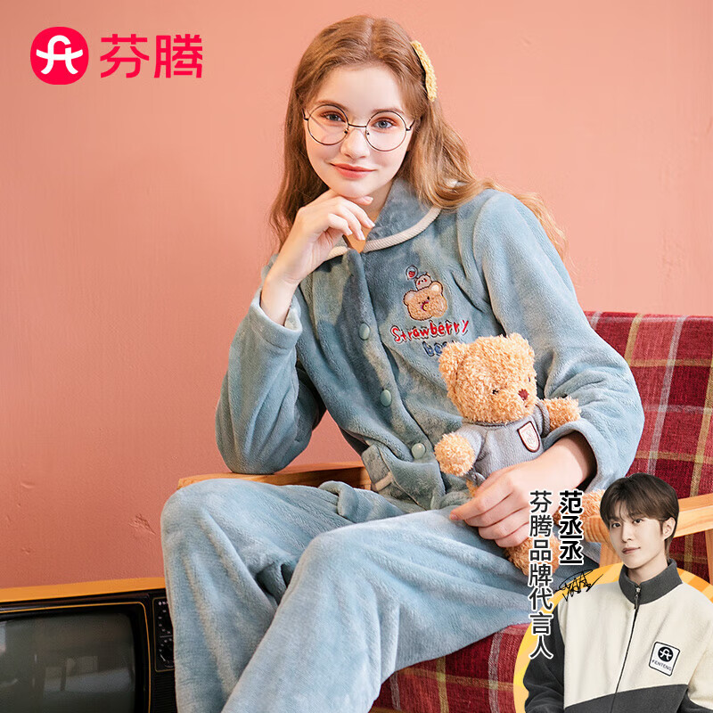 ¥179.9 芬腾 珊瑚绒加厚睡衣女士秋冬新品简约休闲长袖翻领家居服套装女 灰绿-款式A L 209.9