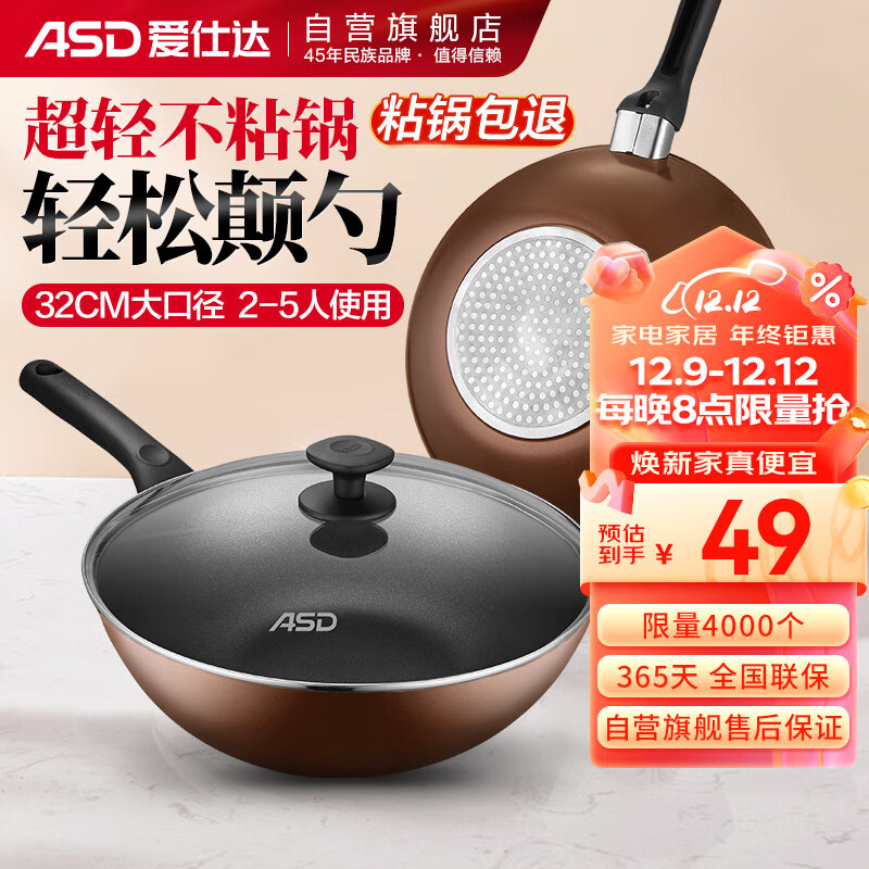 ¥159 爱仕达(ASD)炒锅少烟易洁不粘锅32cm平底炒菜锅电磁炉燃气通用不沾锅EC8332E 209