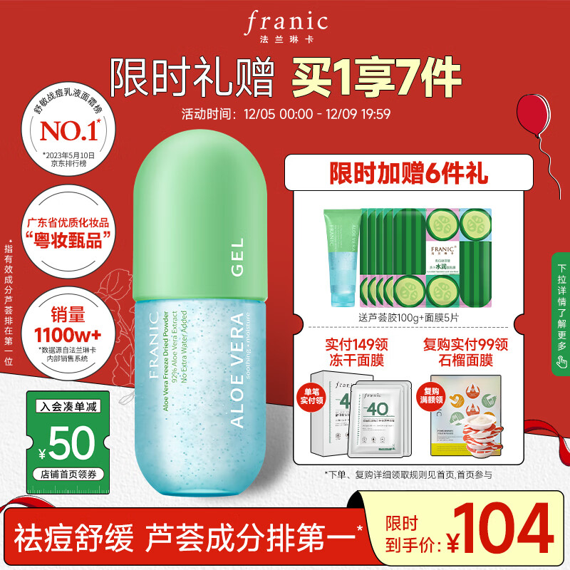 ¥99 法兰琳卡(FRANIC)芦荟胶 祛痘修护晒后呵护补水舒缓芦荟凝胶300g 104