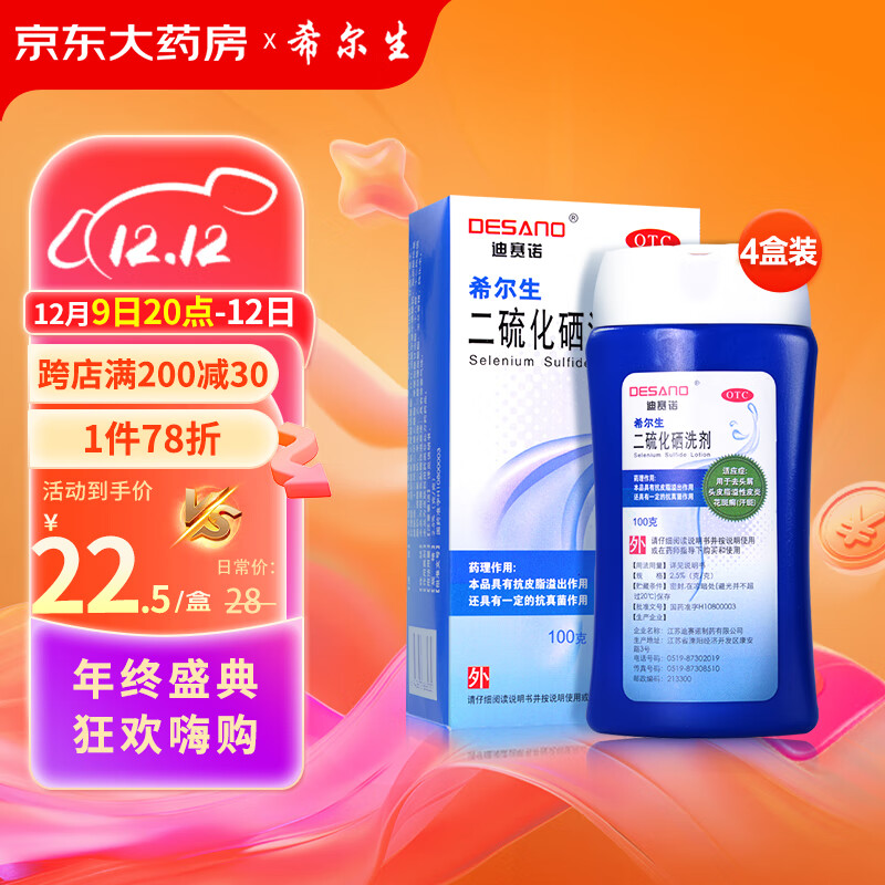 ¥118 迪赛诺 希尔生 二硫化硒洗剂2.5%*100g*4盒 适用去屑头皮脂溢性皮炎花斑癣汗斑 128